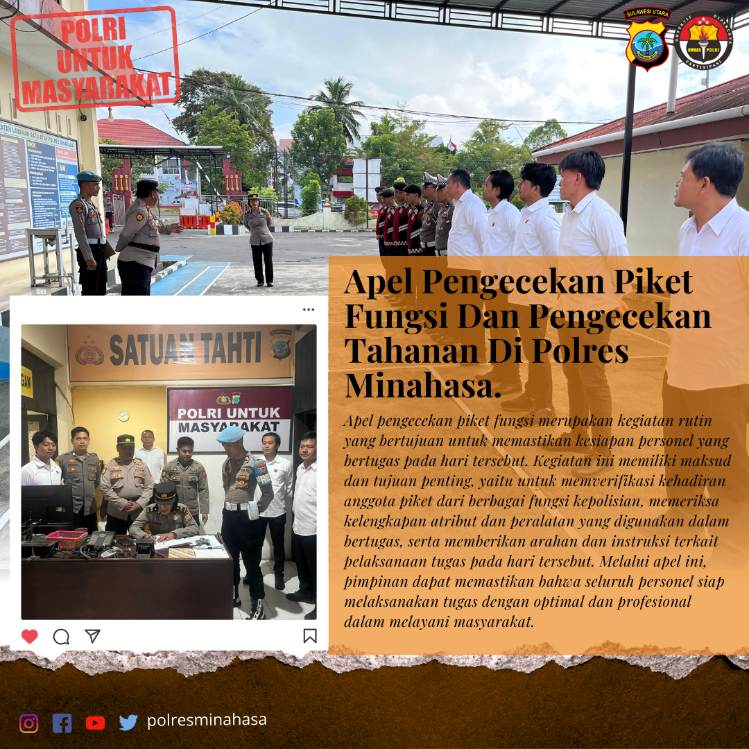 Apel pengecekan piket fungsi merupakan kegiatan rutin yang bertujuan untuk memastikan kesiapan personel yang bertugas pada hari tersebut. Kegiatan ini memiliki maksud dan tujuan penting, yaitu untuk memverifikasi kehadiran anggota piket dari berbagai fungsi kepolisian, memeriksa kelengkapan atribut dan peralatan yang digunakan dalam bertugas, serta memberikan arahan dan instruksi terkait pelaksanaan tugas pada hari tersebut. Melalui apel ini, pimpinan dapat memastikan bahwa seluruh personel siap melaksanakan tugas dengan optimal dan profesional dalam melayani masyarakat.