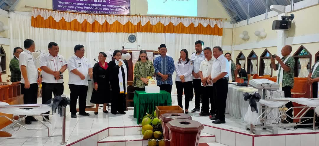 Minahasa- Wakil Bupati Minahasa, Vanda Sarundajang, SS, menghadiri dan memberikan sambutan dalam acara Ibadah Syukur Hari Ulang Tahun (HUT) ke-76 Jemaat GMIM Sion Rumbia yang berlangsung di Gereja GMIM Sion Rumbia, Rabu (23/4/25).