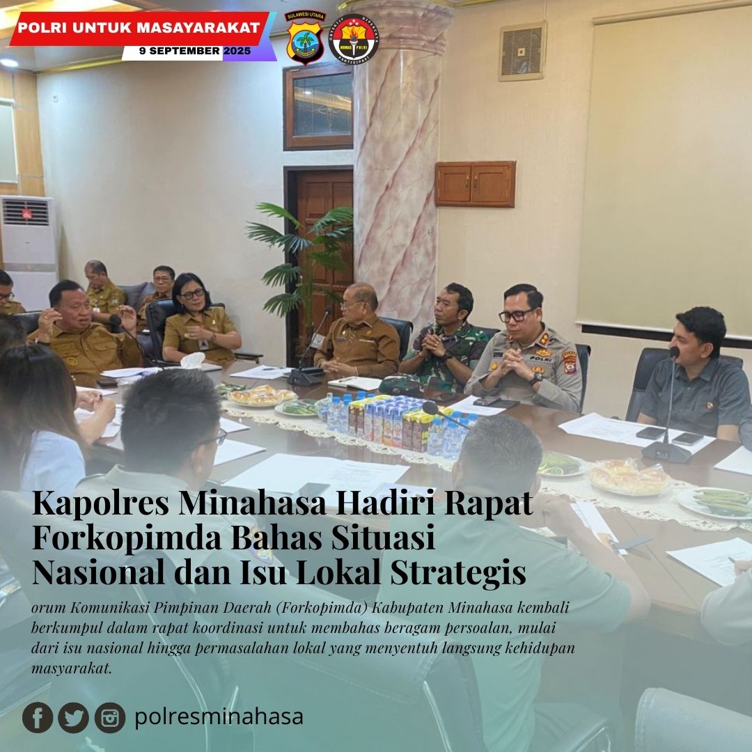 Rapat yang dipimpin Bupati Minahasa DR. (HC) Robby Dondokambey, S.Si., MAP itu dihadiri jajaran Forkopimda, termasuk Kapolres Minahasa AKBP Stevent J.R. Simbar, S.I.K., tokoh agama, dan pejabat terkait. Diskusi berjalan dinamis, mencakup potensi dampak unjuk rasa nasional, isu SPPD fiktif yang menjadi sorotan publik, problem agraria dan distribusi pupuk, hingga peningkatan kasus penganiayaan dan kecelakaan lalu lintas. Bahkan, ancaman virus babi di Sonder dan Tombariri turut menjadi perhatian serius.