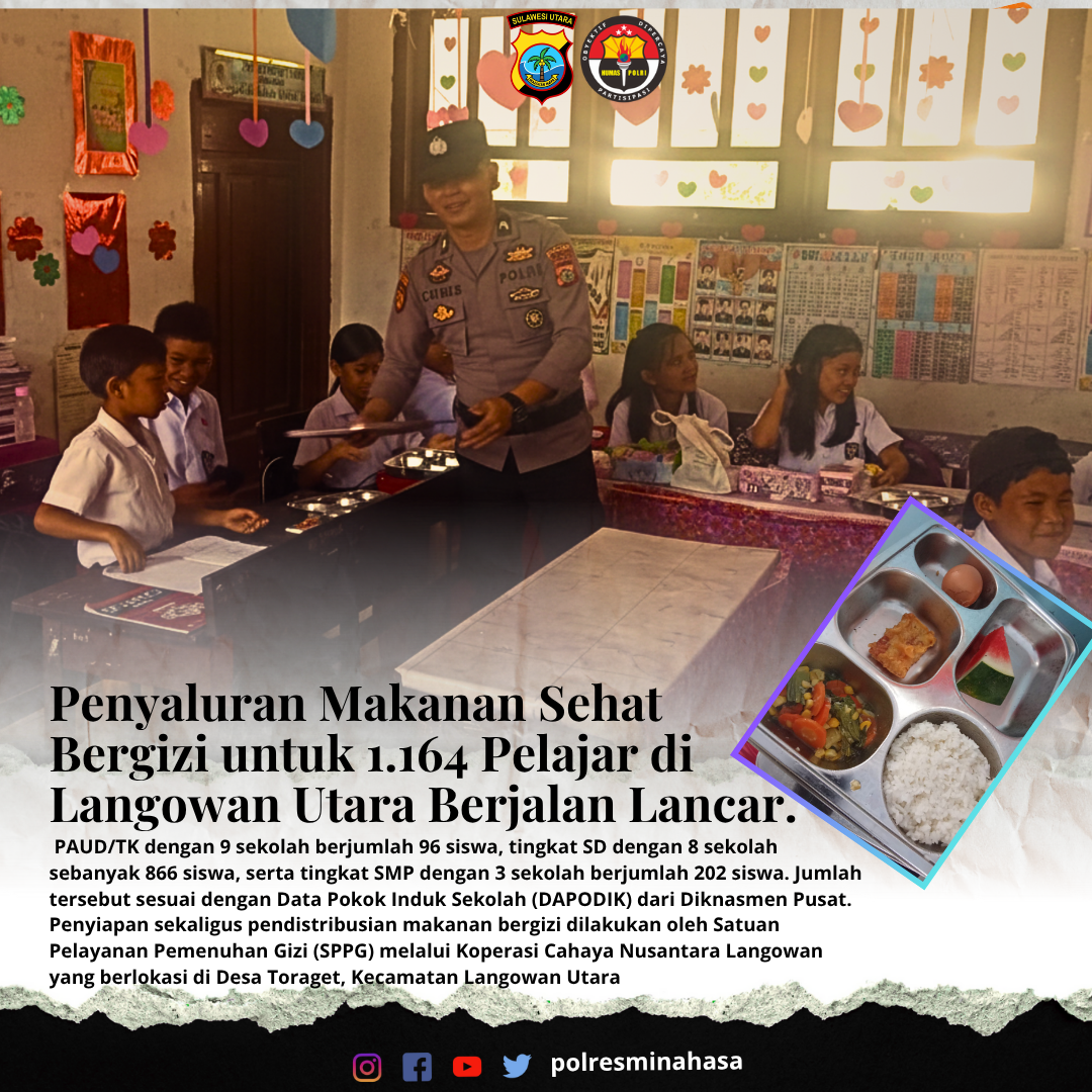Kapolsek Langowan, IPDA March Faldry Makaampoh, S.H., M.H., menyampaikan bahwa kegiatan penyaluran makanan bergizi ini merupakan program yang sangat positif dalam mendukung tumbuh kembang anak. “Kami dari Polsek Langowan memastikan kegiatan ini berjalan aman, tertib, dan lancar. Harapannya, dengan adanya distribusi makanan bergizi, anak-anak kita akan semakin sehat, kuat, dan cerdas dalam menempuh pendidikan,” ujarnya.