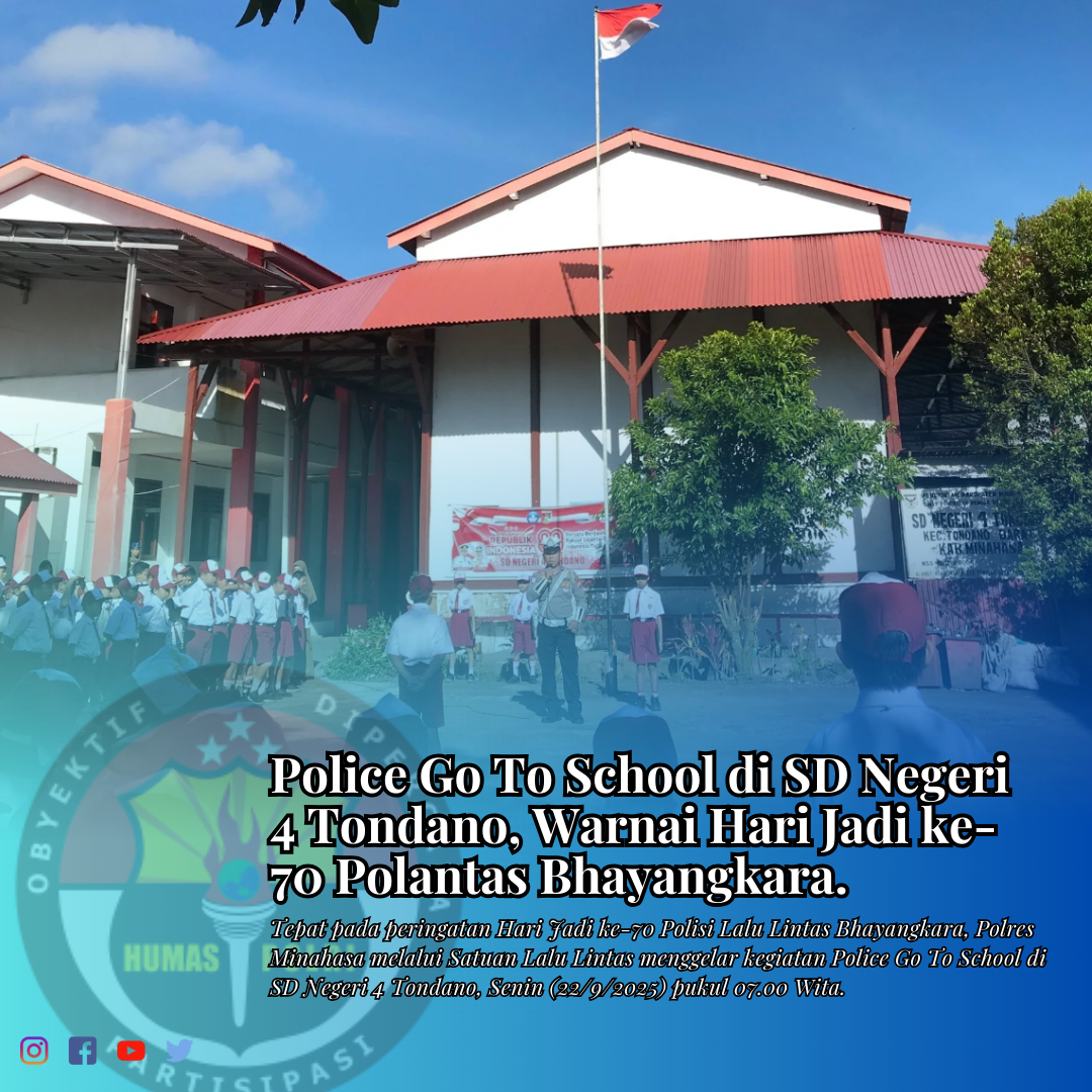 Minahasa – Tepat pada peringatan Hari Jadi ke-70 Polisi Lalu Lintas Bhayangkara, Polres Minahasa melalui Satuan Lalu Lintas menggelar kegiatan Police Go To School di SD Negeri 4 Tondano, Senin (22/9/2025) pukul 07.00 Wita. Dalam kegiatan ini, Kanit Kamseltibcar Lantas, Aipda Jimbri Tumbel, SH, bertindak sebagai pembina upacara bendera yang diikuti seluruh siswa, guru, dan tenaga pendidik.