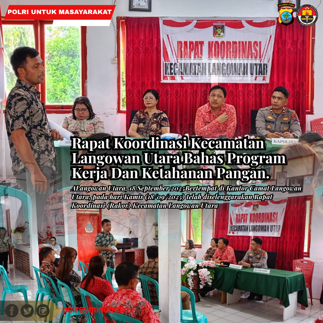 Langowan Utara, 18 September 2025Bertempat di Kantor Camat Langowan Utara, pada hari Kamis (18/09/2025) telah diselenggarakan Rapat Koordinasi (Rakor) Kecamatan Langowan Utara yang dimulai pukul 11.30 WITA. Rapat yang dipimpin langsung oleh Camat Langowan Utara, Evertson Rantung, SH, dihadiri oleh berbagai pejabat dan pemangku kepentingan di wilayah tersebut.