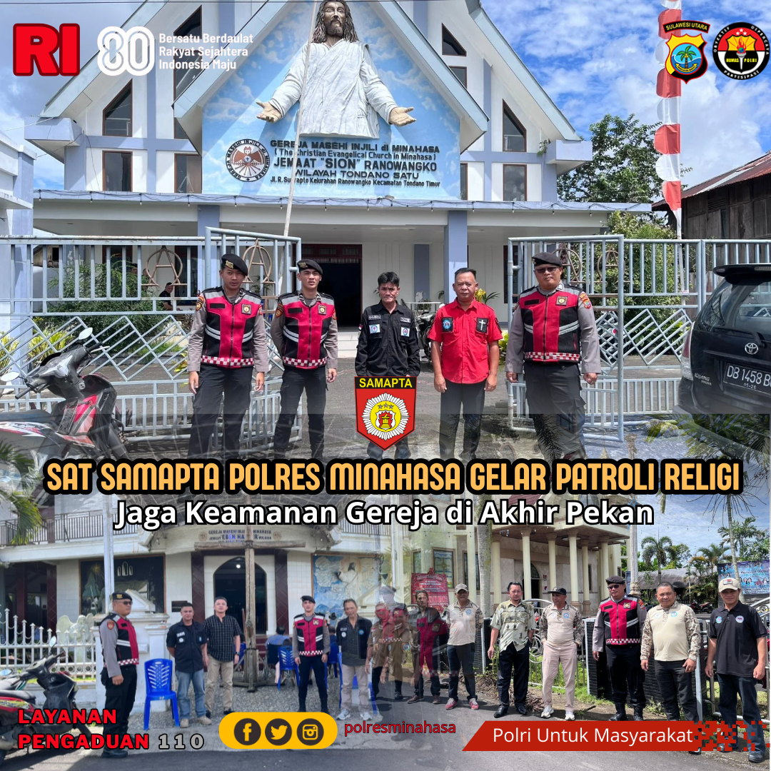 Minahasa – Pada Minggu, 24 Agustus 2025, Sat Samapta Polres Minahasa melaksanakan kegiatan Patroli Religi guna memastikan keamanan dan kenyamanan jemaat saat beribadah di sejumlah gereja di wilayah Minahasa. Kegiatan ini menjadi bentuk nyata kehadiran Polri di tengah masyarakat untuk menjaga situasi kamtibmas yang aman dan kondusif.