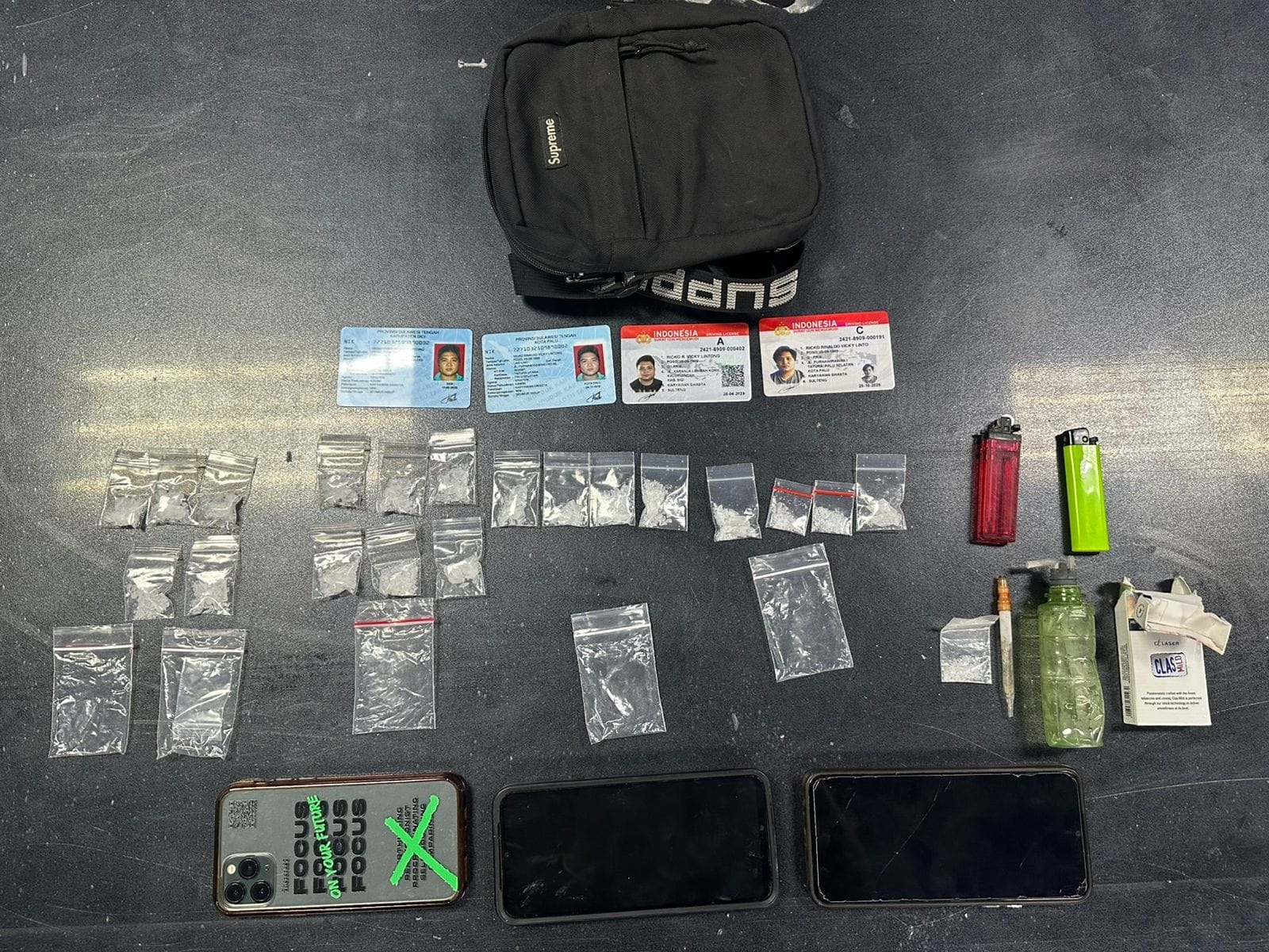 Tim berhasil menemukan 16 paket sabu beserta sisa penggunaan selama perjalanan dari Palu dan alat pemakaian berupa bong. Menurut pengakuan tersangka, sabu tersebut akan diedarkan di wilayah Kawangkoan, Tompaso Baru, dan Manado.