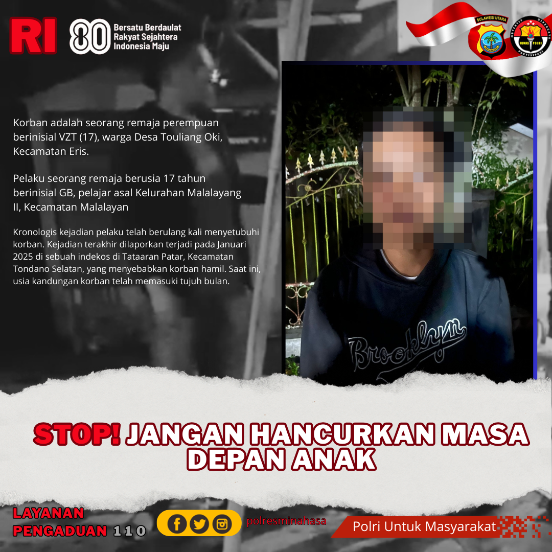 Minahasa – Tim Resmob Polres Minahasa yang dipimpin oleh Kanit Resmob Aipda Hendra Mandang, S.H., berhasil mengamankan seorang remaja berinisial GB (17), pelajar asal Kelurahan Malalayang II, Kecamatan Malalayang. GB diduga kuat melakukan tindak pidana persetubuhan terhadap anak di bawah umur.